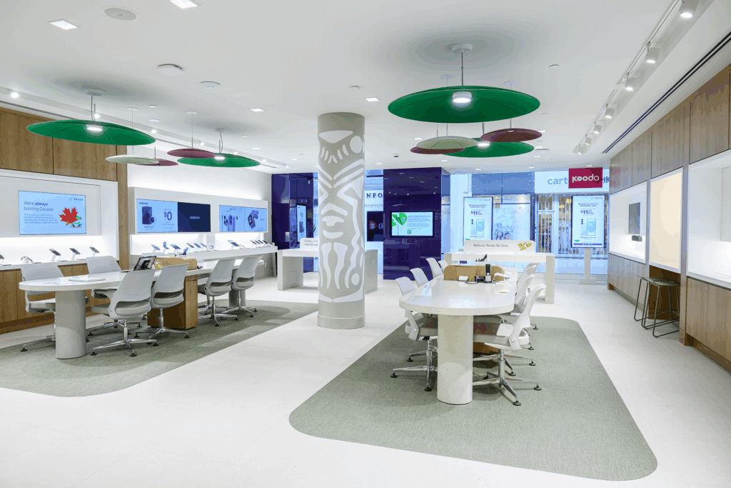 La création d’espaces adaptés à la culture des membres de l’équipe et des clients autochtones dans les bureaux et les boutiques de TELUS est essentielle à notre engagement continu en matière de réconciliation. Ces initiatives visent à cultiver des espaces inclusifs où les membres de l’équipe et les clients autochtones peuvent s’épanouir tout en offrant à toutes et tous des occasions d’apprendre et de respecter les territoires traditionnels où nous travaillons. À ce jour, nous avons repensé trois espaces TELUS dans le cadre de notre engagement envers la préservation des espaces. La Place of Many Rivers à TELUS Harbour a été notre premier projet.